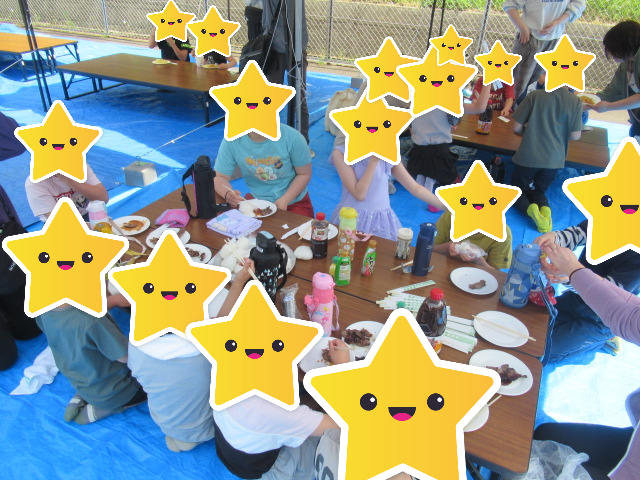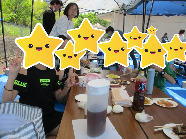 焼きそばやお肉が焼けて、いよいよご飯の時間です。