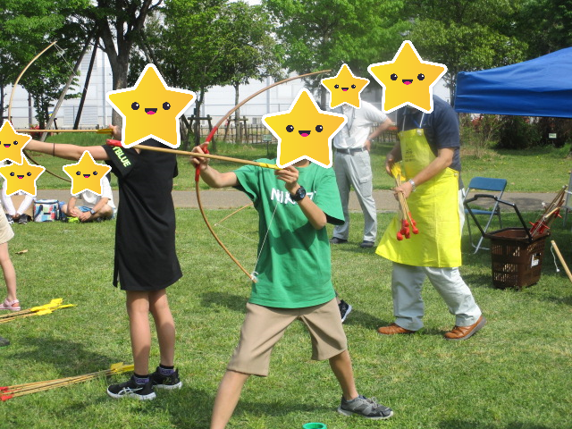 「縄文体験」のコーナーでは弓矢の体験ができます。