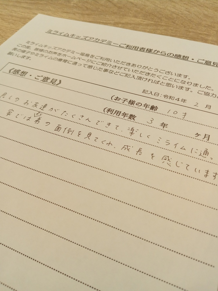 お世話になっております。 不登校の息子で自宅から送迎にてご対応して頂いており、助かっています。 又、先日、相談支援の方も付いたので、ミライムさんを通して、お話して下さると伺っておりましたので、幅広く対応頂けるので、大変助かります。 コロナ禍ですので、十分に対策を行って頂き、又、より多く、運動や外での学習を取り入れて欲しいと思います。