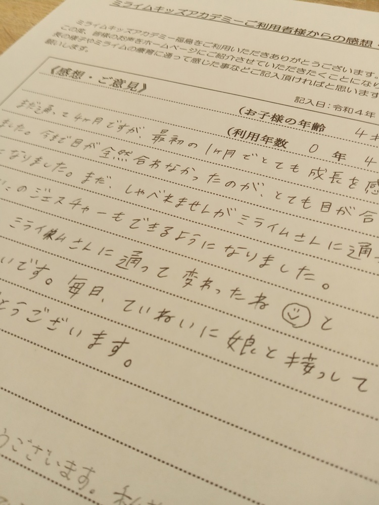 まだ通って4ヶ月ですが、最初の1ヶ月でとても成長を感じました。 今まで目が全然合わなかったのが、とても目が合うようになりました。 まだ、しゃべれませんがミライムさんに通って”お願い”のジェスチャーもできるようになりました。 周りからも、ミライムさんに通って変わったね