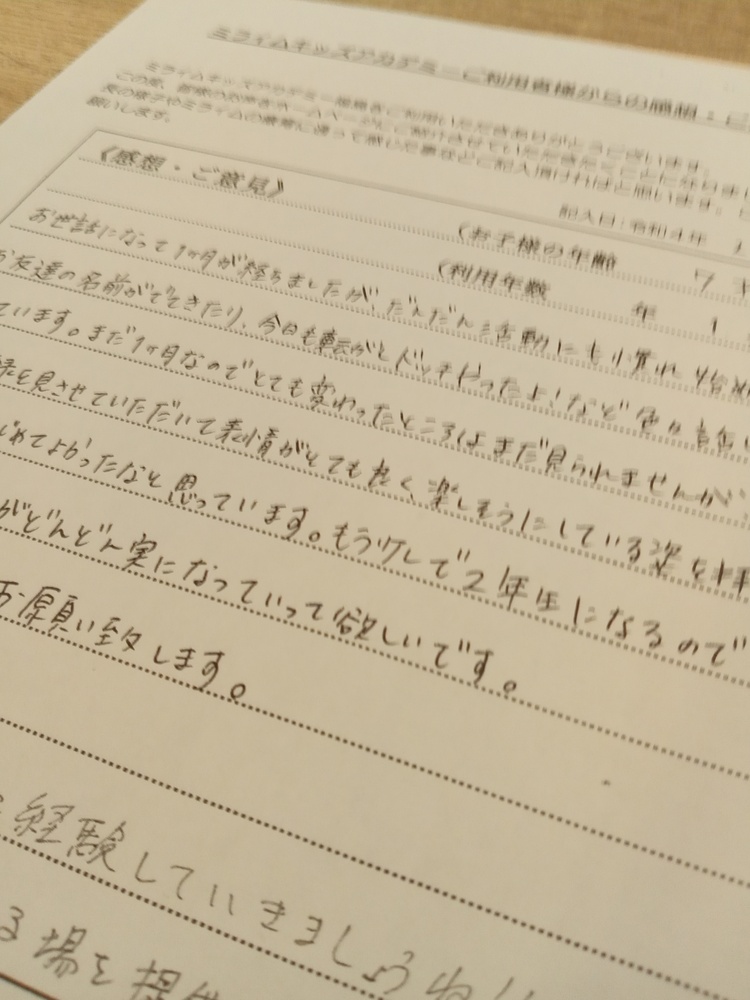 お世話になって1ヶ月が経ちましたが、だんだん活動にも慣れ始めてお友達の名前がでてきたり、今日も転がしどっちやったよ!など色々話してくれています。 まだ1ヶ月なのでとても変わったところはまだ見られませんが、活動記録を見させていただいて表情がとても良く、楽しそうにしている姿を拝見してこちらに通わせはじめてよかったなと思っています。 もう少しで2年生になるのでこちらで学んでいる事がどんどん実になっていって欲しいです。 今後ともどうぞ宜しくお願い致します。