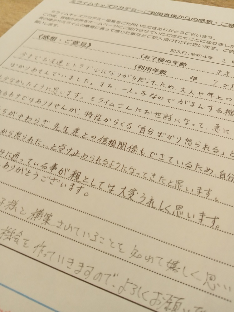 今までお友達とトラブルになりがちだったため、大人や年上の子とばかり遊んでいました。 また、一人っ子なのでがまんする機会も少なかったように思います。 ミライムさんにお世話になって、急に変われるわけではありませんが、特性からくる「自分ばかり怒られる」という気持ちがやわらぎ、先生達との信頼関係もできているため、自分が悪いことをしたから怒られた…と受け止められるようになってきたと思います。 何より、いつも楽しみに通っている事が親としては大変うれしく思います。本当にありがとうございます。