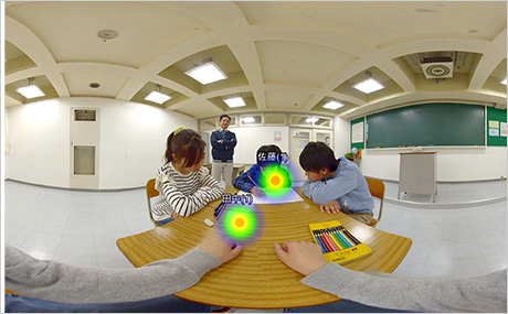 VR空間のなかでどこを見ていたか視点データを記録。人の顔を見て話をきけているか、場面に応じた場所を見ていたかなどを振り返ることができます
