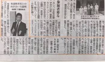 7月15日に開催された山内先生の特別支援教育講演会を、 7月25日(火)福島民報様の朝刊に掲載して頂きました。 次回は11月3日(金)に福島県青少年会館で講演会を予定しております。 http://fukushima-youth.com/youth/